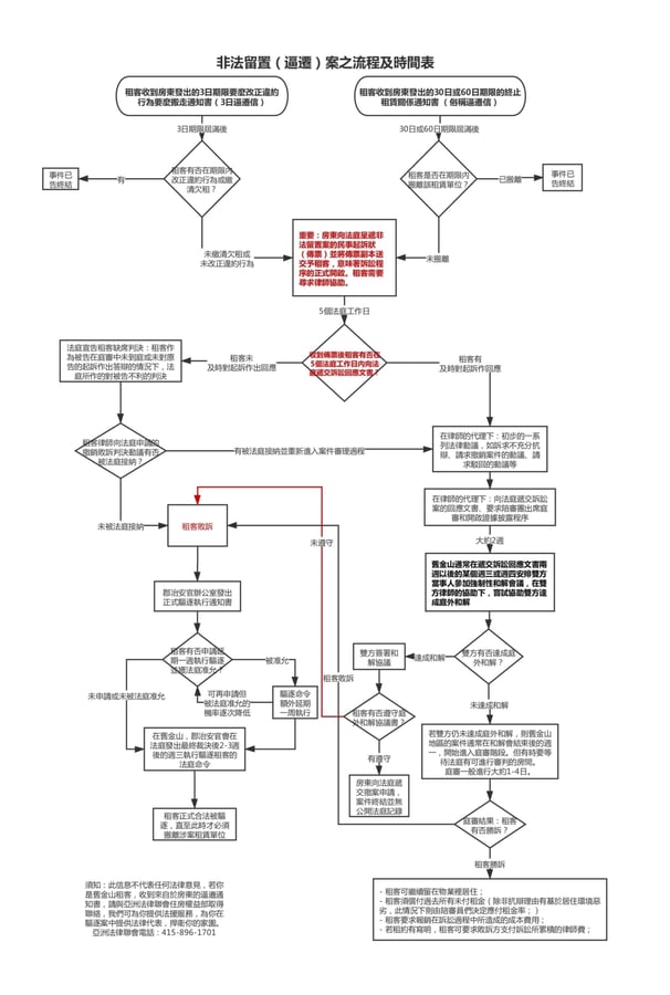 如果您收到書面驅逐通知,請立即與抗逼遷聯盟(EDC)聯繫(415)659-9184或legal@evictiondefense.org。如果您是亞太裔美國人, 老年人,低收入和非英語使用者,請聯繫亞洲法律聯會(415)896-1701。如果您收到“非法佔有者的傳票和投訴”,則必須在5天內對此做出回應,否則您將自動敗訴,並可能被法庭司警驅逐。驅逐過程非常迅速,因此立即尋求法律幫助非常重要。不要忽略驅逐通知或法院文件。
