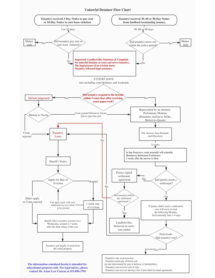 If you received a written eviction notice, please contact the Eviction Defense Collaborative immediately (415) 659-9184 or legal@evictiondefense.org. If you are API, senior, low-income, and non-English speaking, please contact the Asian Law Caucus (415) 896-1701.If you receive a “Summons and Complaint for Unlawful Detainer”, you must respond to this within 5 days, or you will lose automatically and can be evicted by a Sheriff. The eviction process moves very quickly so it is important to find legal help immediately. DO NOT IGNORE an eviction notice or court papers.
