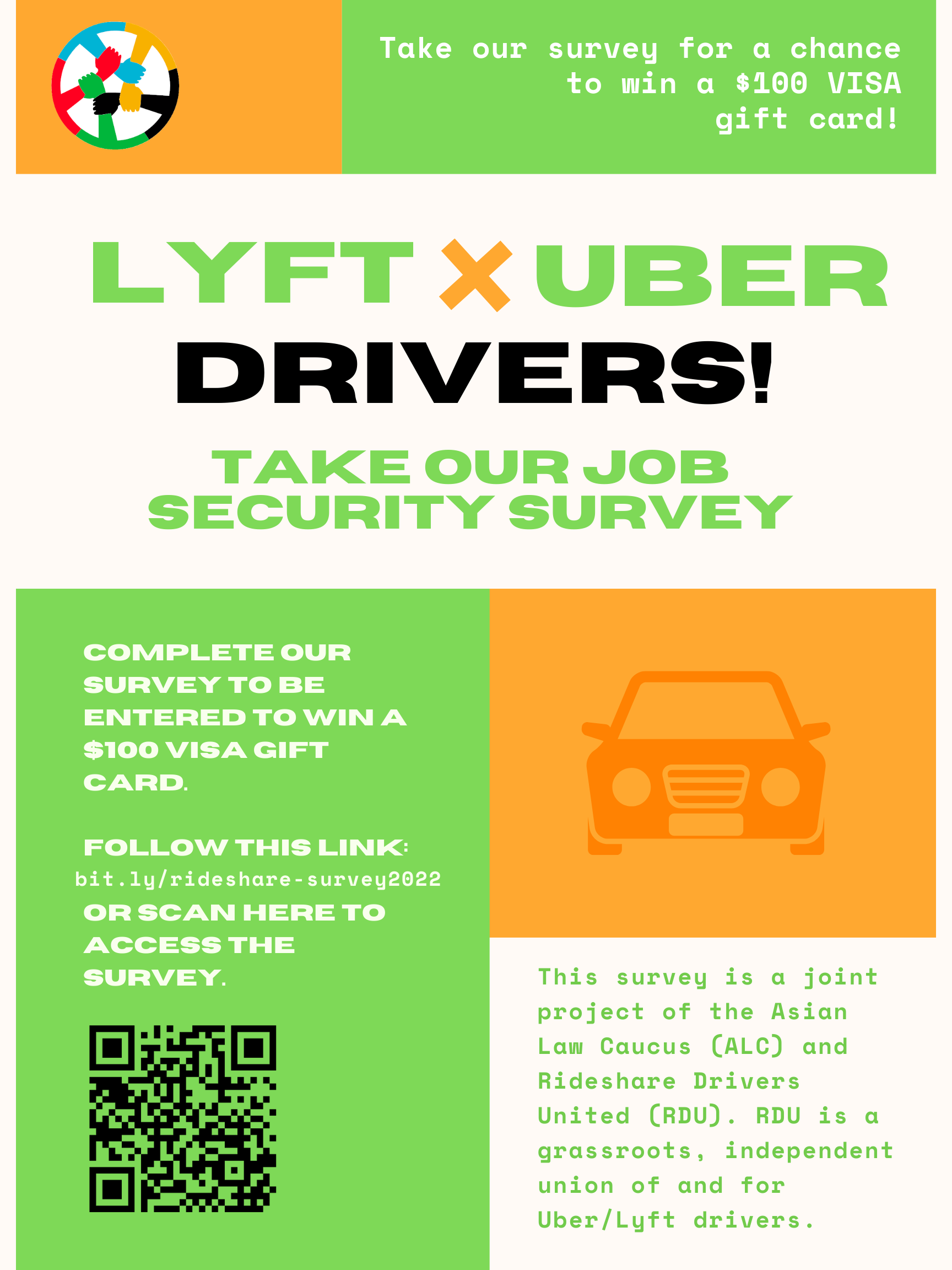 This survey is a joint project of the Asian Law Caucus (ALC) and Rideshare Drivers United (RDU). RDU is a grassroots, independent union of and for Uber/Lyft drivers. The survey seeks to collect information about the ways in which customer bias or discrimination may impact drivers’ experiences at work, customer ratings, deactivation, and more. The survey findings will be published in a report.